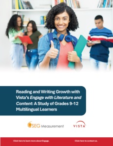 © 2025 Vista Higher Learning Reading and Writing Growth with Vista’s Engage iii INTRODUCTION SEG Measurement conducted a study to find out how well Vista Higher Learning’s Engage with Literature and Content program helps high school multilingual learners (MLs) improve their English reading and writing skills. The study took place in six Arizona high schools during the 2024–2025 school year and included 171 students in grades 9–12. Students used Engage throughout the year as part of their English language instruction. Their reading and writing growth was measured using the Arizona English Language Learner Assessment (AZELLA) at the beginning and end of the school year. The results showed that students who learned with Engage made clear, measurable progress in both reading and writing. The program worked equally well for boys and girls and for students from di erent ethnic backgrounds, showing that it supports all learners. It was also especially e ective for students who began the year at the lowest proficiency levels, helping them make the greatest gains. This report includes three main parts: • An overview of the Engage program, the study design, and the research questions • A description of the data collected and how the analysis was conducted • The study results, conclusions, and what they mean for classroom practice Together, these findings show that Engage is an e ective, classroom-tested program that helps multilingual learners strengthen their reading and writing skills and build confidence as English users.